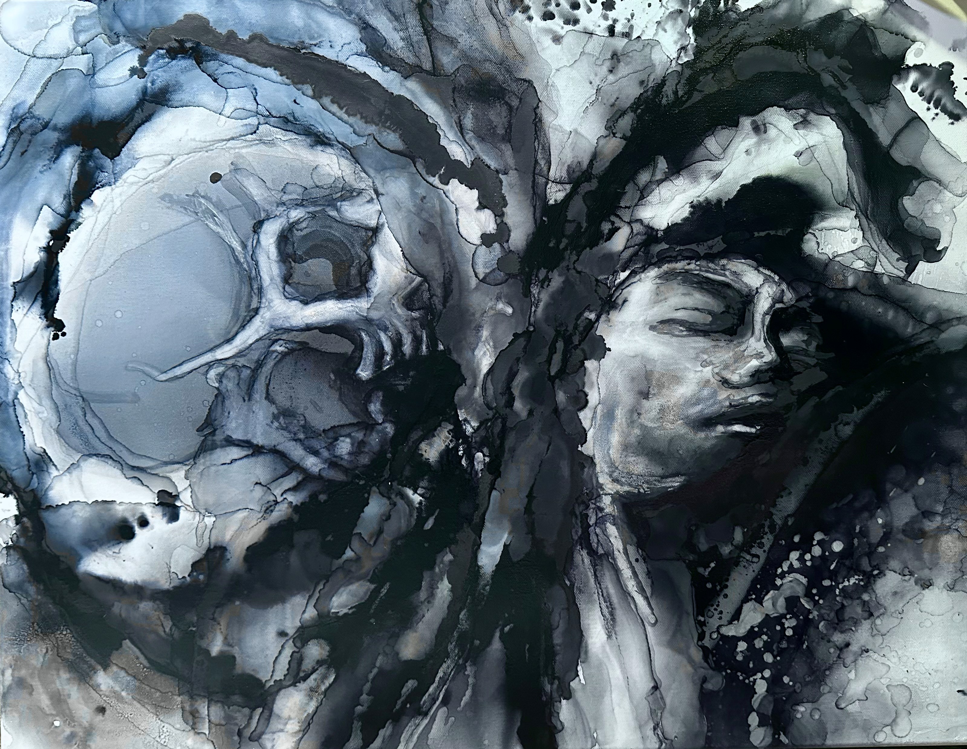 NoxOra's art invites us to explore our own emotional landscapes through her dark, beautiful lens. Her distinctive technique transforms ink and alcohol into something alive and unpredictable - just like human emotion.