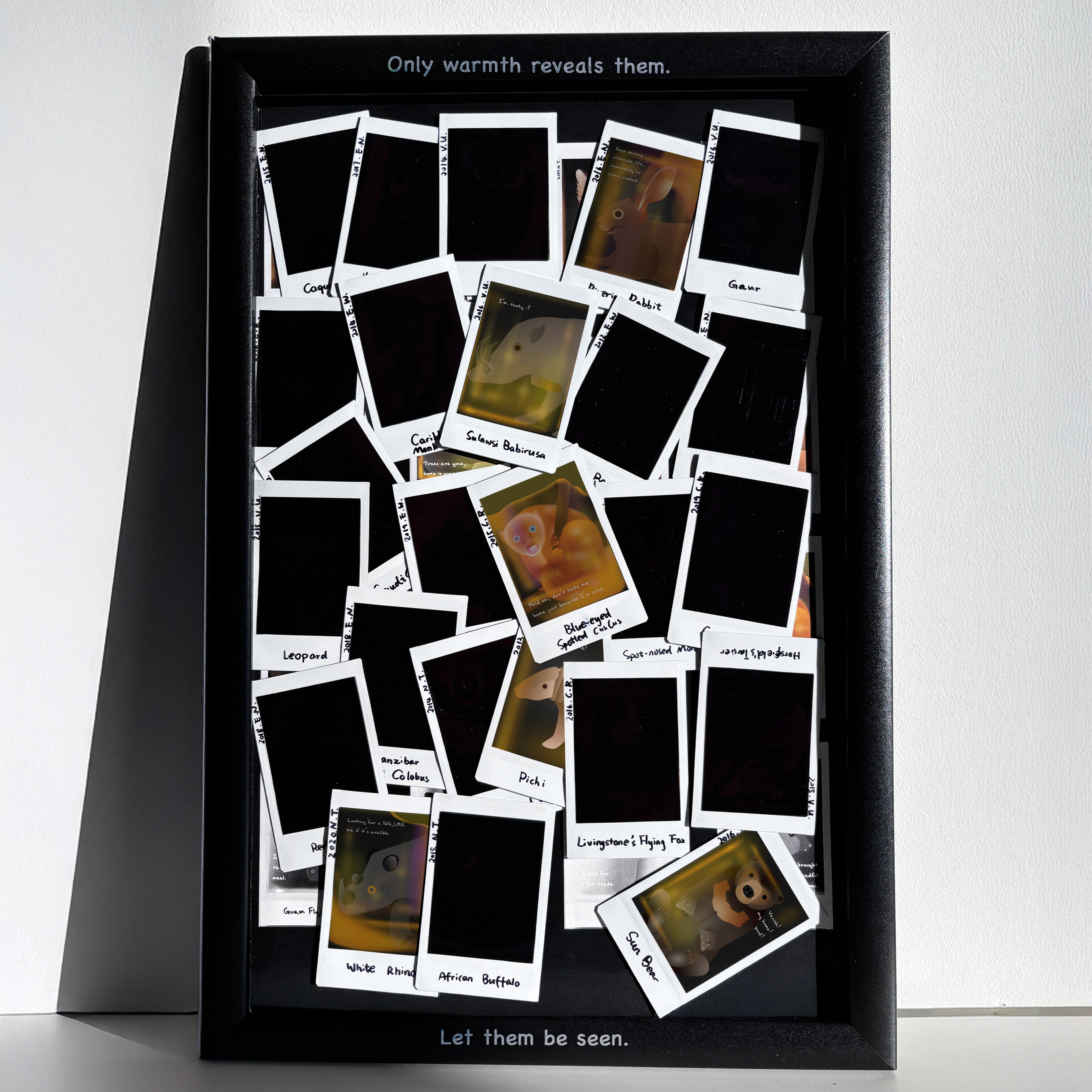 Thermal Animals. A thermochromic interactive installation where animals emerge only through human warmth—inviting viewers to “see” endangered species through care, touch, and responsibility.